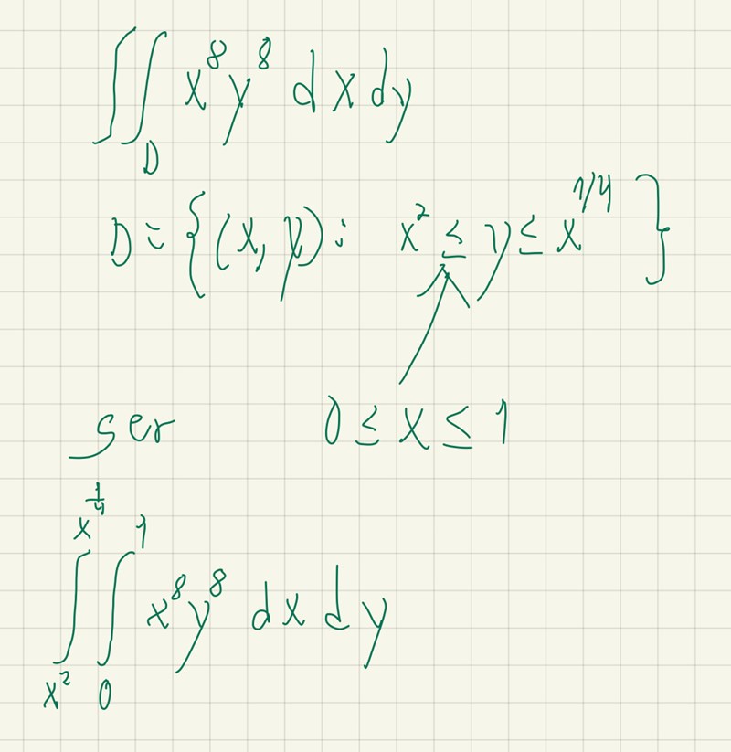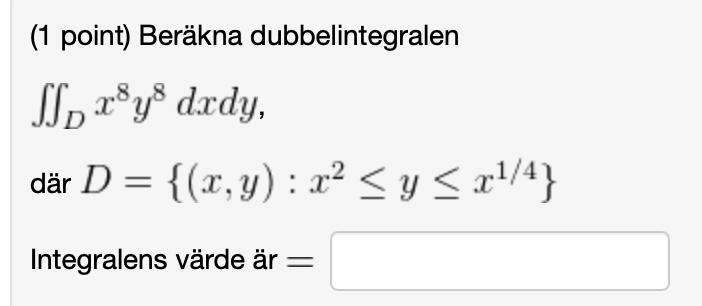 Dubbelintegralen beräknas som två stycken itererade enkelintegraler.