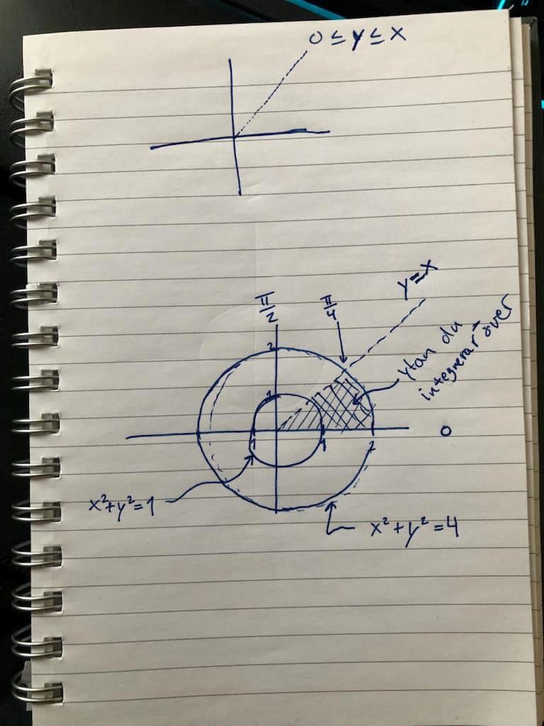 Jag tänker att jag måste hitta integralens begränsningar samt göra om till polära koordinater. Jag är tyvärr inte jätte duktig på polära koordinater och försöker just nu att bli bättre. Tänker jag rätt?