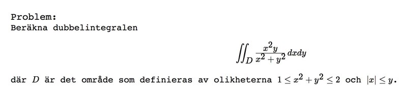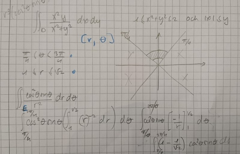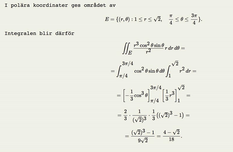 Det andra är att när man byter till polära koordinater måste man ha med ett extra framför . Det är ungefär som när man gör ett variabelbyte med en enkelintegral och säger att , fast i det här fallet blir det .
