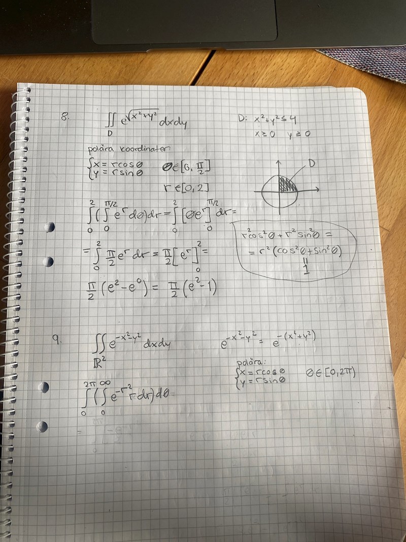 På 8) behövs inte jacobimatrisen ”r” användas. Men på 9) används det. I båda har jag använt variabelsubstitution, och ska man inte gångar med jacobimatrisen då? Men det behövdes inte i 8), jag fick rätt svar ändå.