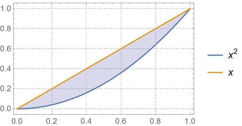 För varje fixt ska variera från (den gula kurvan y=x) till (den blå kurvan y=x^2)
