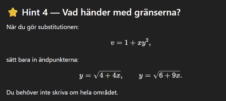 En annan och sista fråga är varför kan jag inte, efter jag substituerat med v = 1+xy2 och bestämt dess gränser... Varför måste jag bara substituera in för vad y är. Varför kan jag inte sätta in vad x var definierad för också eller blir det konstigt vid integraler... liksom vi vet ju vad x kan vara som minst och mest men Chatgpt säger att vi bör ha x i olikheterna... Varför?