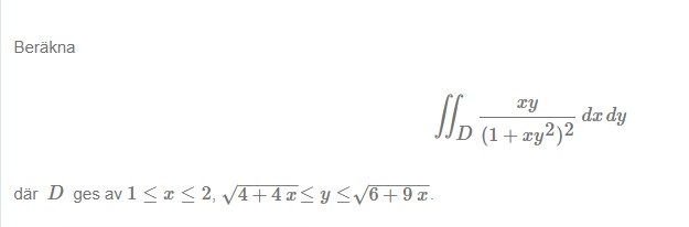 Kolla denna uppgiften är konstig eller så är det bara jag, den känns så svårberäknad med alla bråktal. Jag prövade dubbelvariabelsubstitution (med u,v och inkluderade jakobideterminanten)... svaret krävde miniräknare och ändå blev det fel. Jag frågade Chatgpt också och den fick fram att detta skulle användas. Måste jag kunna denna?