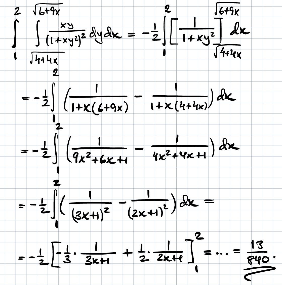Aja jag använde mig av sedan av dv=2xydy (för kom nyss ihåg att man kunde substituera och nu tror jag jag vet varför det alltid är 2xy, det är på grund av derivatan av 1+xy2 blir just 2xy). Aja, och sen så var bråk beräkningen också inte så himla rolig... asså... jag venne... detta är bara en uppgift.