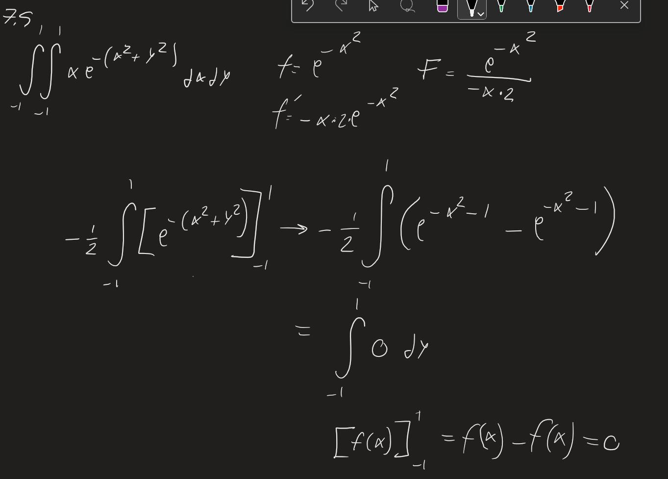 Notera att den andra integralen över y inte går att skriva i elementära funktioner. Men eftersom att första integralen blir 0 behöver vi inte fundera över det.