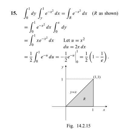 Rf(x,y)dxdy=y=01{x=y1e-x2dx}dy . \iint_{R}f(x,y)\,\text{d}x\text{d}y = \int_{y=0}^{1}\{\int_{x=y}^{1}e^{-x^2}\,\text{d}x\}\,\text{d}y\ .