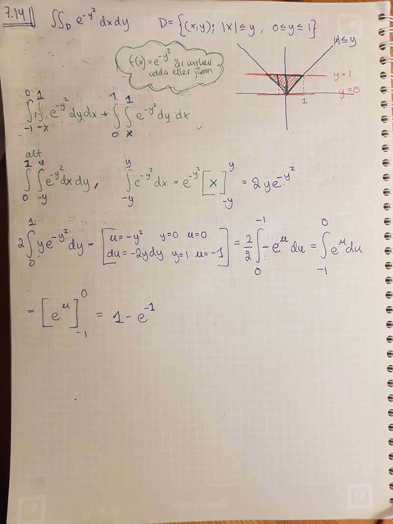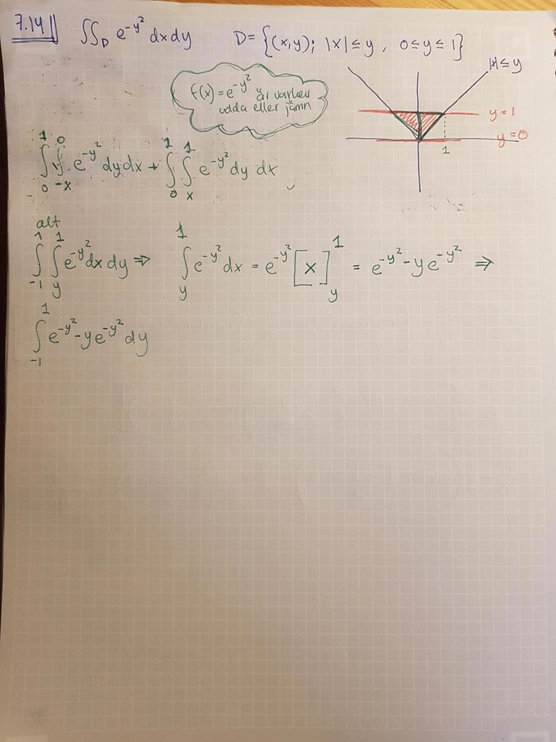 Tror jag har målat in mig i ett hörn igen. Osäker på gränserna, men värst är att jag inte lyckas "göra mig av med" e^(-y^2) som jag i sin tur inte lyckas integrera.