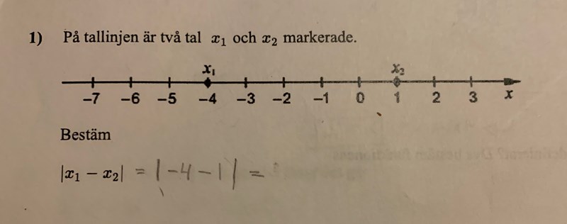 Avståndet mellan -4 och 1. |-4-(+1)|=|-5|= 5