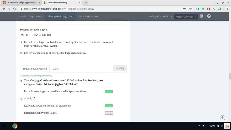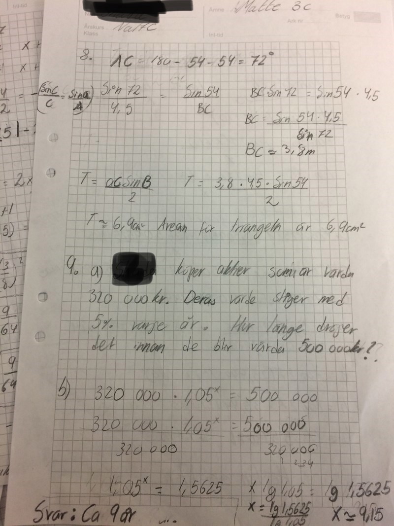 Uppgift 9b. Jag saknar följande mening: Det tar xx år för aktierna att bli värda 0.50.5 miljoner kronor, där xx uppfyller ekvationen 320000·1.05x=500000320000 \cdot 1.05^{x} = 500000.