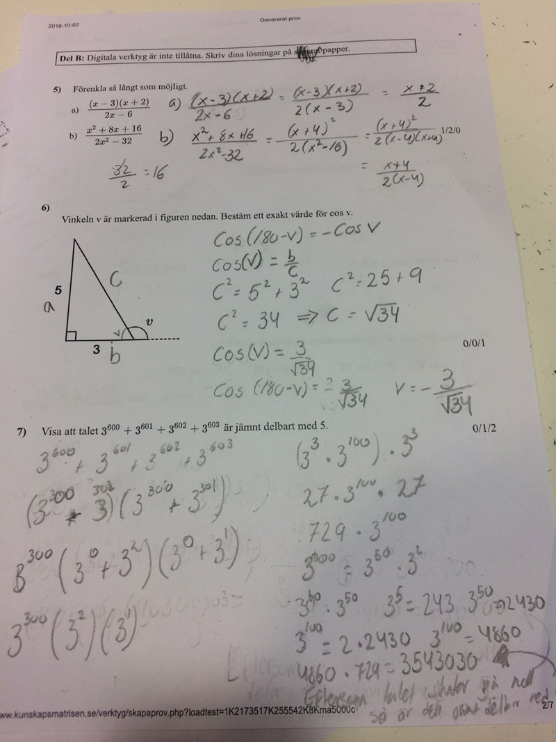 6. Inte korrekt. Du har skrivit att cos(v)=b/c, men cos(v) skall vara ett negativt tal.