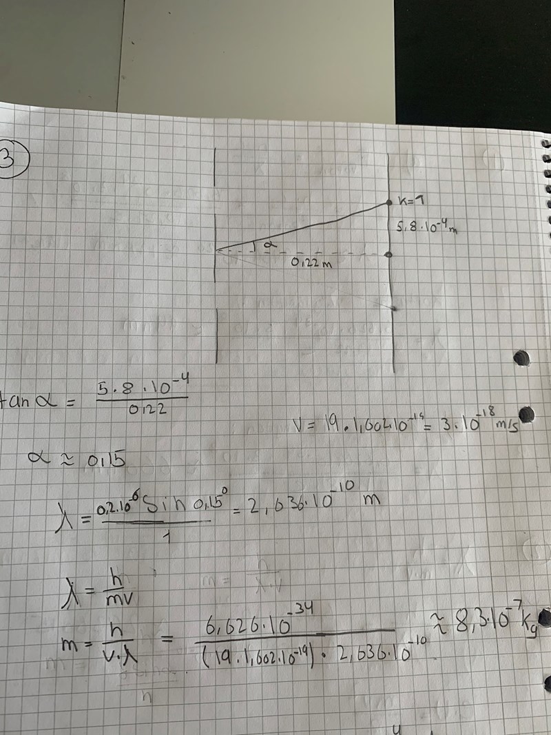 Tog reda på denna vinkel, för att därefter kunna använda formeln för ljusmaxima i dubbelspalt och bryta ut våglängden ur denna. Därefter använder jag de broiglea formel och bryter ut massan ur den, men får inte rätt svar