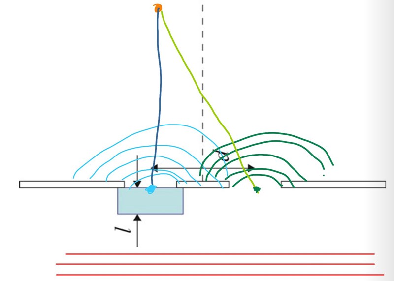 Efter spalterna sprids vågorna p.g.a diffraktion. Du söker positionen på skärmen (orange prick) där den gröna vågen har färdats 15.6 våglängder längre än den blå från spalten så att de åter är i fas och interfererar konstruktivt.