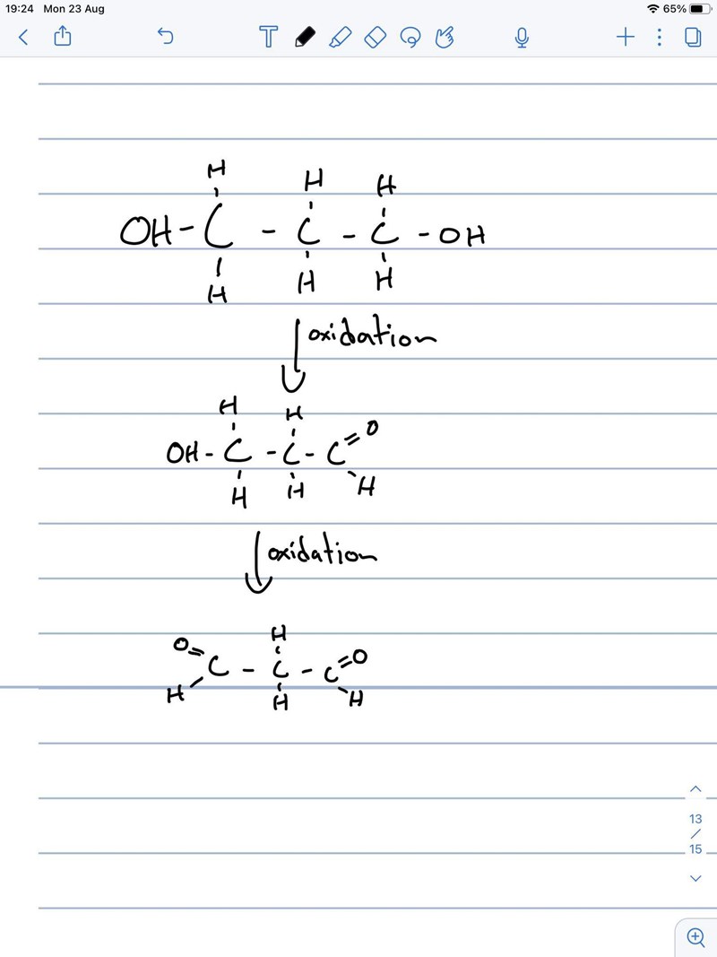 Jag förstår att man vid försiktig oxidation av en primär alkohol får en aldehyd, t.ex. propanal om man försiktigt oxiderar propanol. Det jag undrar är om det i teorin är möjligt att få en aldehydgrupp, dvs. CHO även på den motsatta sidan av den primära alkoholen så att man får två CHO-grupper på de två olika ändarna av alkoholen. Eller är det så att man först oundvikligen kommer att producera en karboxylsyra vid fortsatt oxidation av en aldehyd?