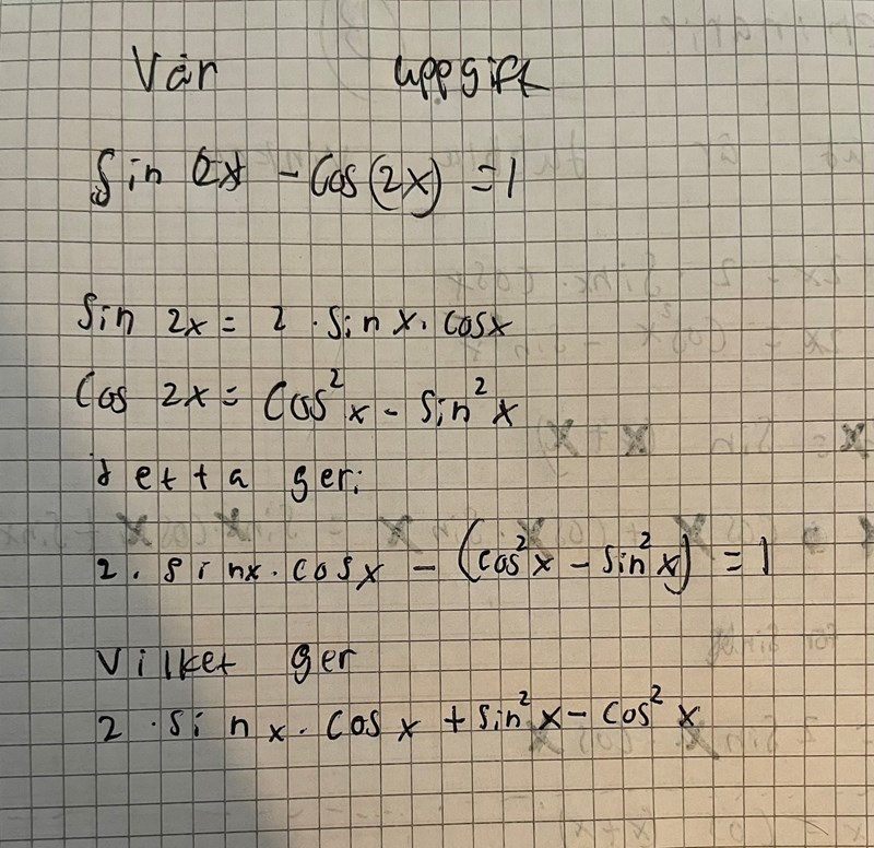 Det är korrekt hittils. Vidare kan du addera och cos2x till varje led vilket ger dig den trigonometriska etta i VL. Därefter kan du stryka 1 i HL och VL samt skriva om allt till VL. Slutligen faktoriserar du ut termer och använder dig av nollproduktsmetoden för att bestämma lösningen