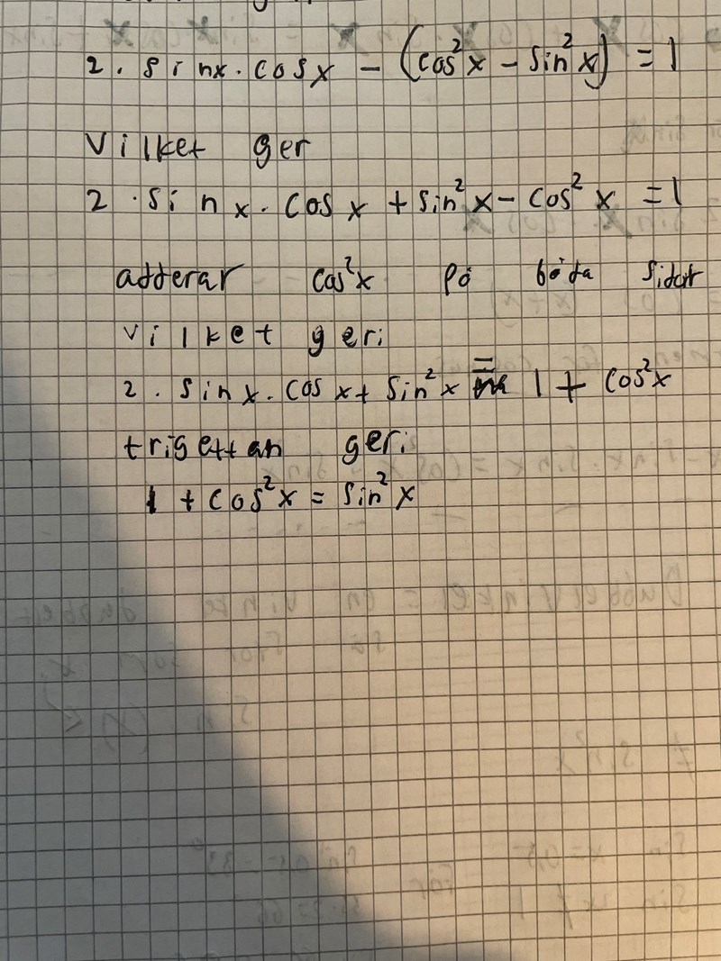 för det första är allt det korrekt? Alltså att om man adderar cos^2 (x) på båda sidorna så blir det det som står längst ner i föregående inlägg?
