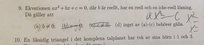 Hejsan igen, jag ser inget sätt som man kan få en icke-reell och en reell lösning då b är reell, fallet som jag hittade ger att b inte verkar vara reellt. Jag lyckades klura ut att c inte kan bli 0 då nollproduktsmetoden ej ger en icke-reell lösning (b reellt). Om c=0 fås antingen två icke reella eller två reella lösningar beroende på a:s tecken så vi stryker den. Hur borde man göra för att komma fram till att b ska vara skilt från 0? Jag ser inga fall där detta kan vara fallet. Tack på förhand.