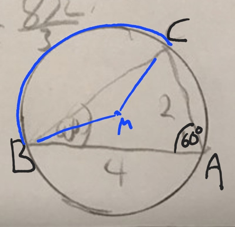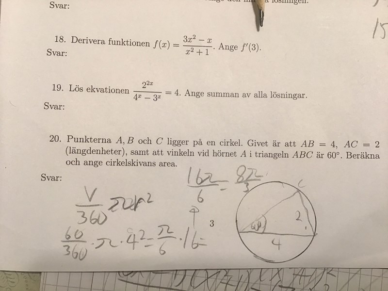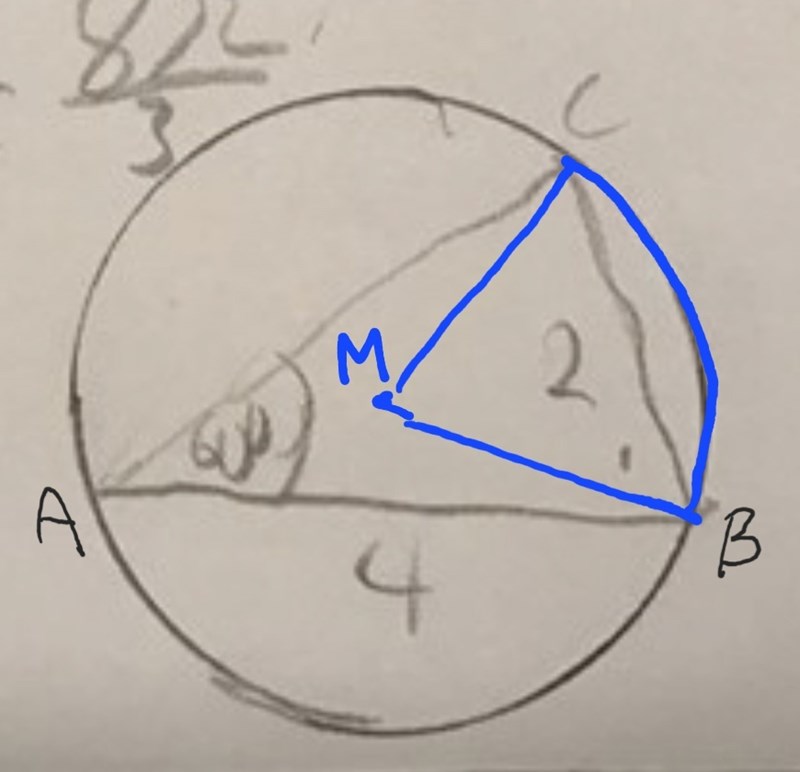 Tack! Men hur kan det här tillämpas? Vi får att vinkeln M blir 120grader, men jag ser inte riktigt hur man kan få fram radien till cirkelsektorn och för att kunna beräkna dess area. Sedan så är de lite oklart vilken cirkelskiva man ska beräkna arean på, vill de att man ska betrakta AB som en 180 graders vinkel och sedan beräkna arean ur det här? Det gav (utgående från [den felaktiga?] förmodan att radien blir 2) så det kan inte vara riktigt. Om vi räknar på 120 grader med r=2 fås . Förlåt mig för att jag inte ser det, men vilken area är det egentligen som efterfrågas? Det är en ganska stor skillnad mellan och de areor som jag fått fram hittills.