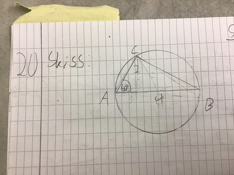 - Eftersom de har varit snälla visar det sig att vinkeln vid C är 90 grader. Nu kan du använda randvinkelsatsen för att inse att AB är diametern i cirkeln.