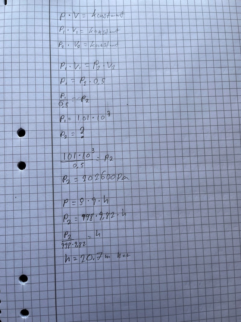 Jag antog att trycket är 101,3 * 10^3 vid vatten utan och 202,6 *10^3 där volymen blir hälften så mycket. Jag tror att jag har bara räknat med Pa i hela uppgiften?