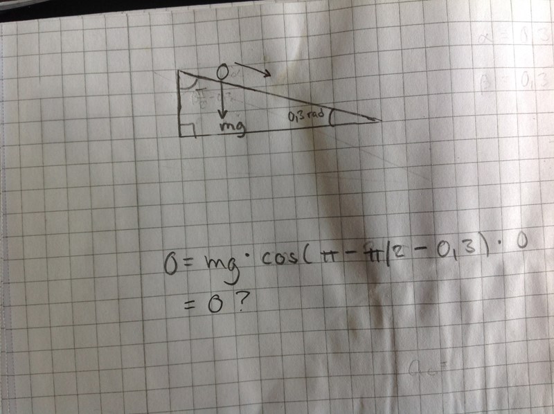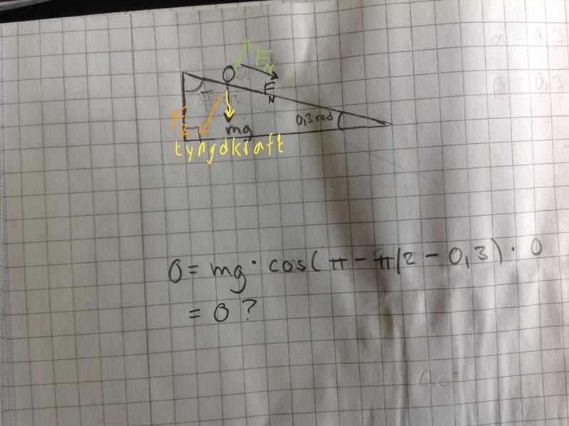 Jag har varit bland massvis av sidor och googlat en del och antecknat en hel del. Sju sidor gilla med kladd (både fram- och baksidorna). Vet inte hur jag fick fram det men läste om någon liknande uppgift där det stod att deras accelerations ekvation var "a = g*cos (alfa) (vilket är fel) och sedan stod det att hos 20% så var ekvationen a=g*cos (alfa)-g*0,2. Accelerationen påverkas av g? Du ser det direkt i ekvationen. Är det inte lite logiskt tänkande här?