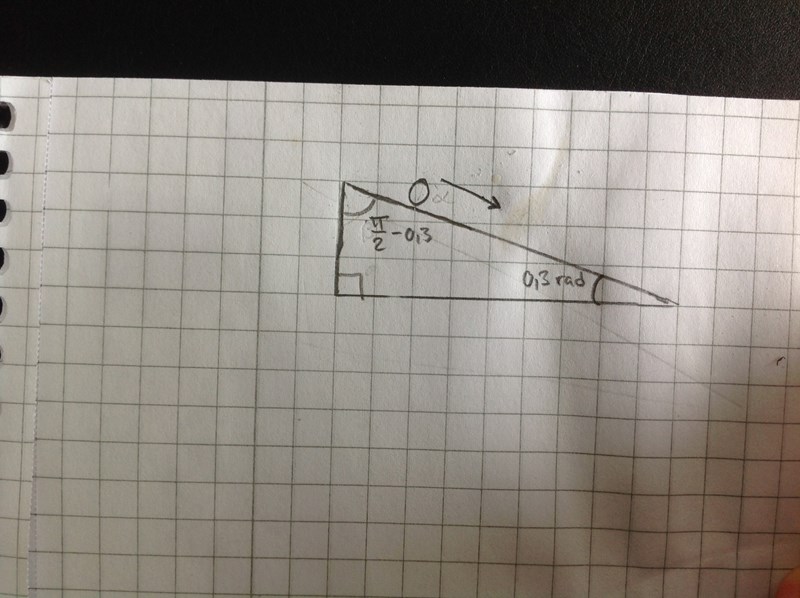 Om det inte finns någon bild, bör du rita en. Har du gjort det till uppgift 2? Verkar det rimligt att en lutning med 0,3 radianer motsvarar en nästan lodrät vinkel?