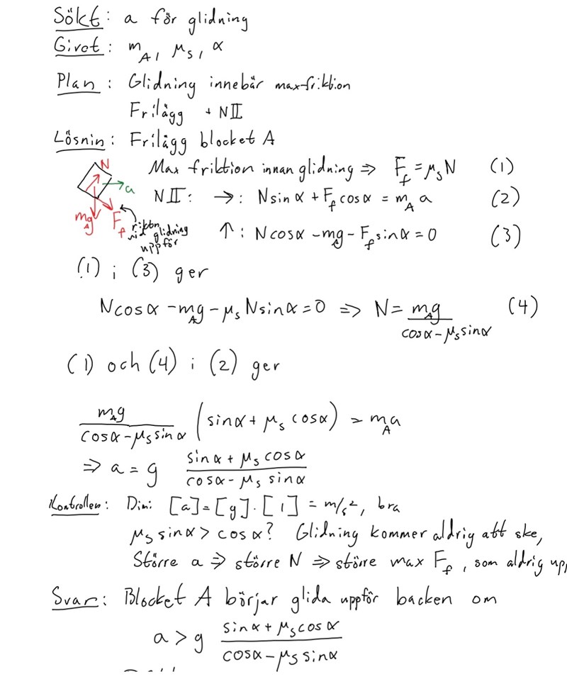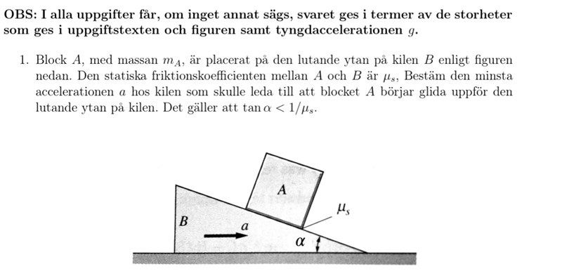 För att uppgiften inte är som den brukar vara, lutande planet. Här är det en kil som accelererar. Och den utöver en kraft på blocket så att även den accelererar.