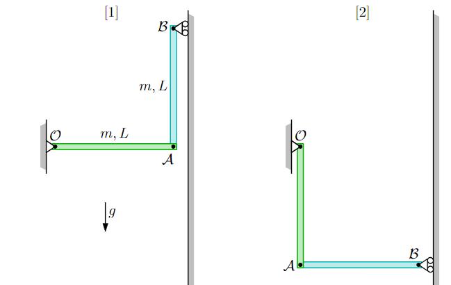 "Två smala homogena stänger, vardera med massan m och längden L, är sammankopplade med en friktionsfri sprint vid A. Stången OA är ledlagrad vid O. Stödet vid B tillåter vertikal rörelse hos ändpunkten för stång AB. Konstruktionen släpps från vila i läge [1]. Försumma friktionen och bestäm farten för punkten B i läge [2]. (m, L och g är givna storheter)"