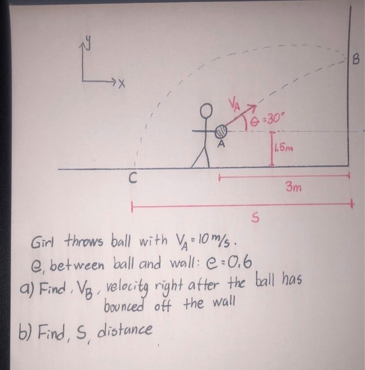 Eftersom det inte står något om energiförluster vid väggstudsen så antar vi att hastigheten i x-led efter studsen endast byter riktning, inte storlek.