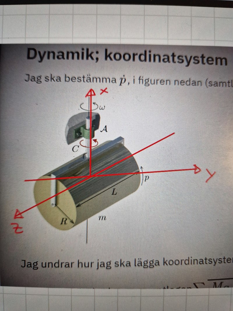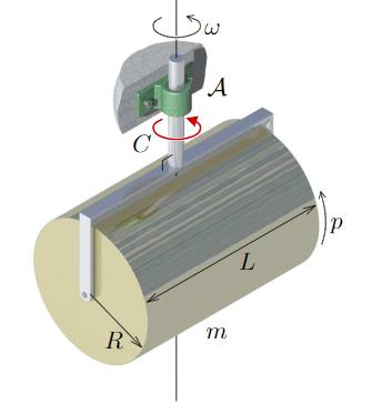 "En homogen cylinder med massan m, radien R och längden L roterar med en vinkelhastighet p relativt en gaffel. Gaffeln är fastsvetsad på en axel, som roterar med vinkelhastigheten ω, samt påverkas av ett kraftparsmoment C. Gaffeln och axeln är masslösa, mekanismen är friktionsfri, och lagren mellan cylindern och gaffeln är momentfria. Bestäm ̇p. (m, R ,L ,C ,p och ω är kända storheter, och gravitationen försummas)"