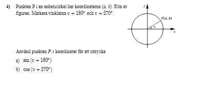 Rita figur, sätt ut v+180, markera en punkt på enhetscirkeln som representerar v+180, vad blir punkten?