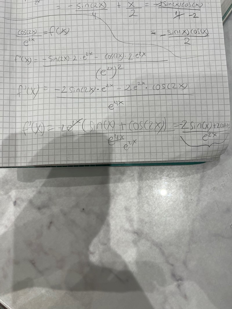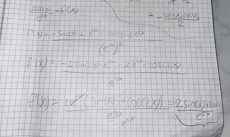 I näst sista raden har du 2 st negativa termer i täljaren. I sista raden har du en positiv och en negativ. Något ofördelaktigt har hänt när du bryter ut -2e2x .