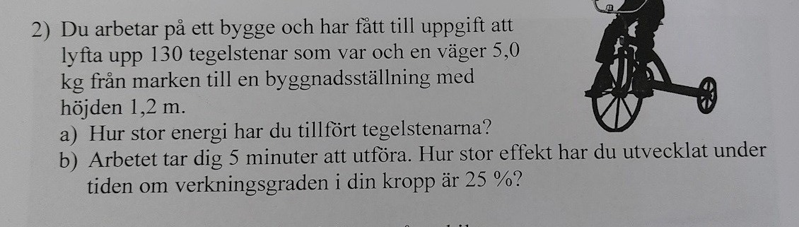 Hej! Jag löste uppgift 2 a) och fick att den tillförda energin är 7659.6 J. I b) uppgiften söker vi effekten.