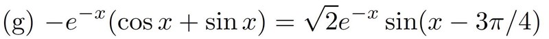 -e^(-x) * (cos x + sin x) = sqrt(2) * e^(-x) * sin(x - 3pi/4)? Hur? (omskrivning)