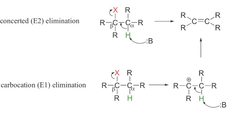 E2-mekanismen gynnas av en stark bas. E1 kräver också en bas som kan abstrahera en proton från karbokatintermediären som bildas, men den behöver inte vara stark.