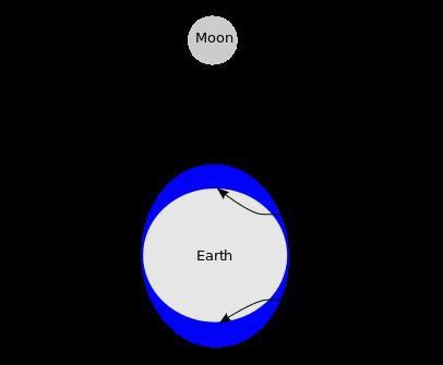 Månen hänger still på himlen. Allt vatten kan röra sig fritt. Då borde vattnet centrera sig runt den gemensamma tyngdpunkten (jämför himlakroppars sfäriska form) och följaktligen försöka forma en sfär runt den gemensamma tyngdpunkten. Då blir vattnet som högst på månsidan och som lägst på frånsidan. Rotationen runt det gemensamma masscentrum ändrar på detta.