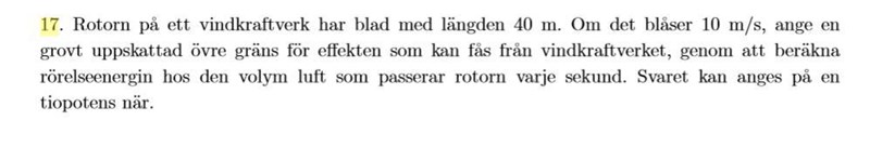 Frågan är vilken area man ska räkna med. En cirkel med radie 20 m kanske. Om den har arean A passerar det 10A kubikmeter luft per sekund, alltså 10A kg luft med hastigheten 10. Formeln för rörelseenergin ger nu effekten.
