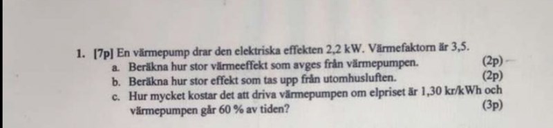 Var ett tag sedan jag läste termodynamik men har för mig att du med hjälp av värmefaktorn och eleffekten kan räkna ut totala effekten som går in i systemet (uppgift a)