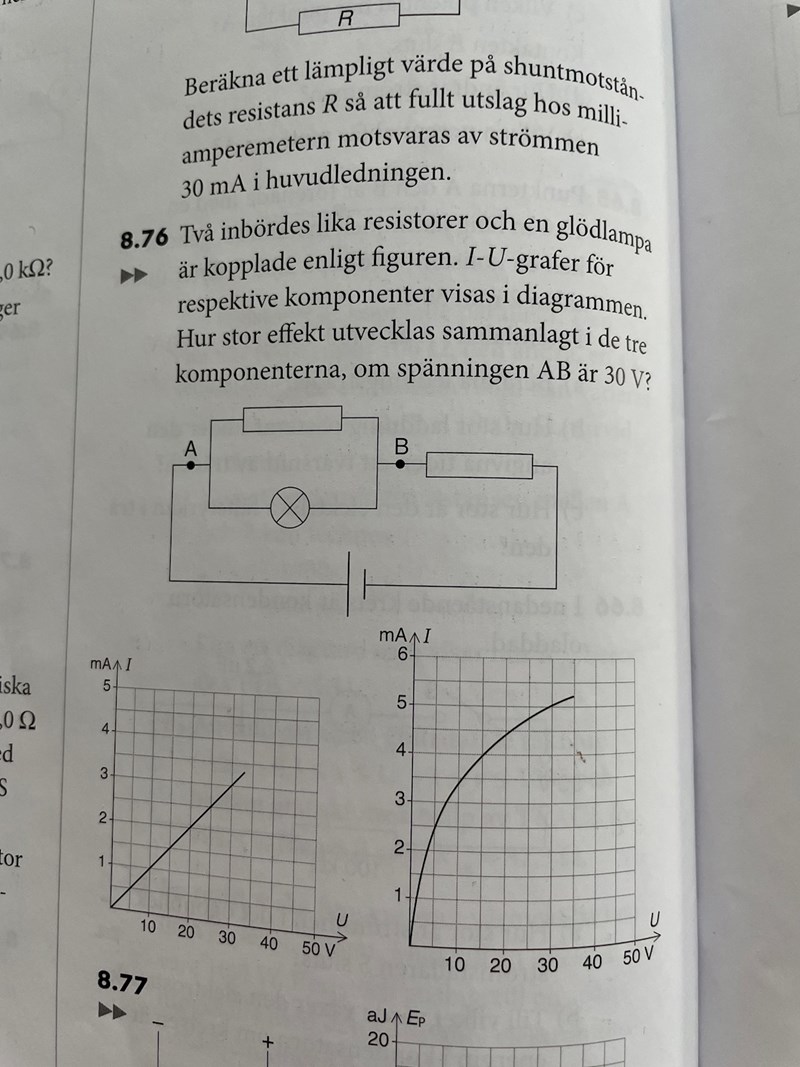 R för seriekopplade resistorn: U/I=30/(8*10^-3)=3750