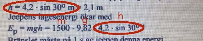 det står ju att Ep = mgh = 1500 x 9,82 x 4,2 x sin 30 grader J