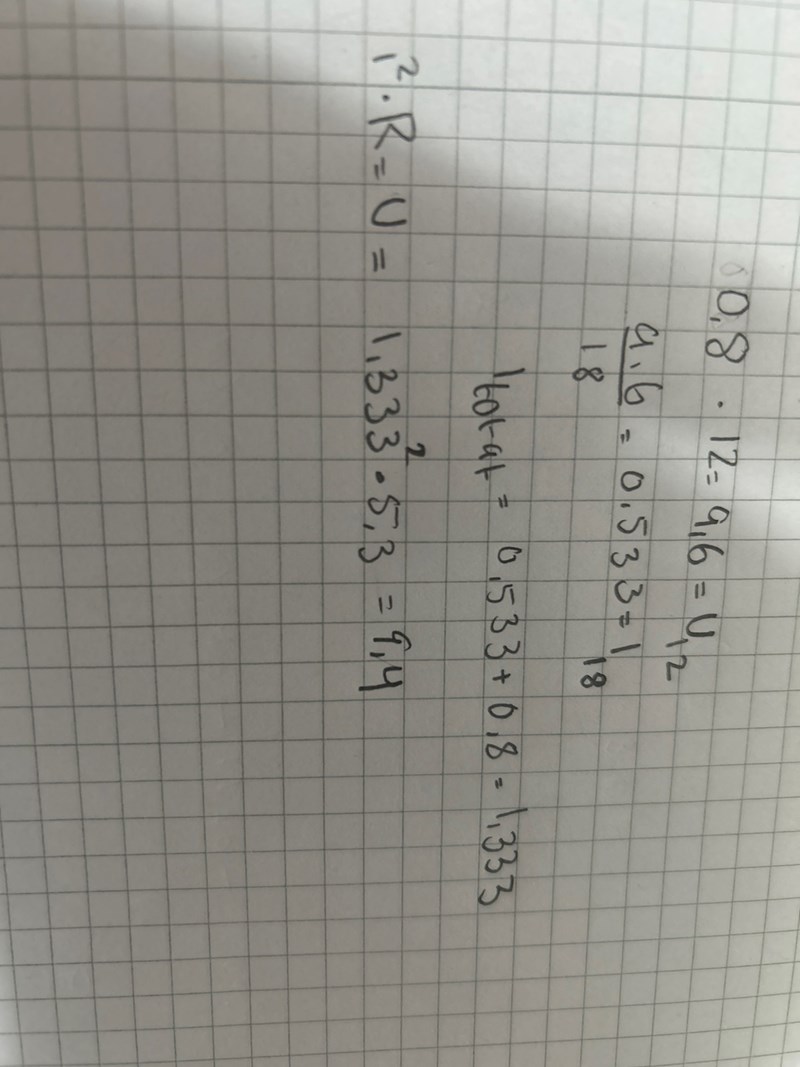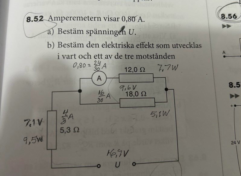 jag vet att strömmen är 0.8 och att R är 5,3 , fick svaret till 3,392 vilket inte stämmer med facit då det säger 7,7 är effekten