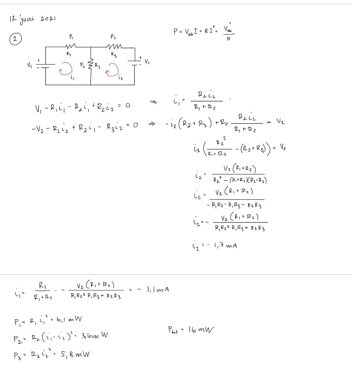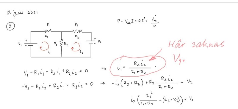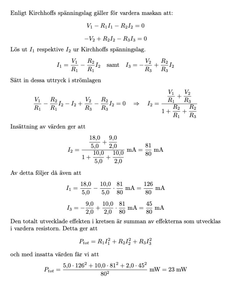 Hej! Man kan ju lösa uppgiften genom att införa 3 strömmar så som lösningsförslaget gör, men sen har vi också lärt oss att men kan göra potentialvandringar i maskor så som jag gör. Vad är det som blir fel i min lösning?
