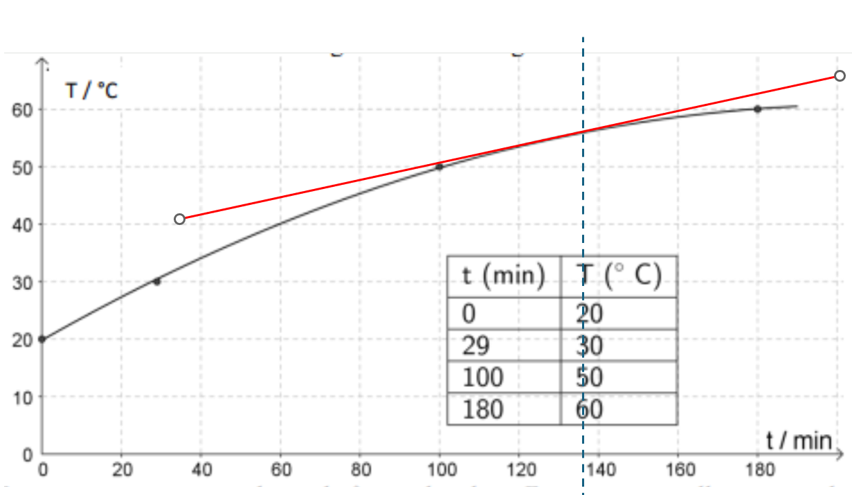 Pieter försökte avläsa så bra temperaturvärden han kunde, vid t=135 och t=20, baserat på min tangent som jag försökte göra så bra jag kunde (flera osäkerheter, alltså)