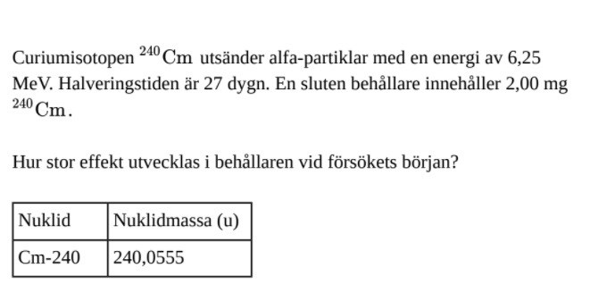 Du vill få reda på effekten dvs: . Tiden kan du bestämma som vad du vill då det inte påverkar effekten. Ett sönderfall ger 6,25 MeV, men du måste veta hur många sönderfall som sker i behållaren.