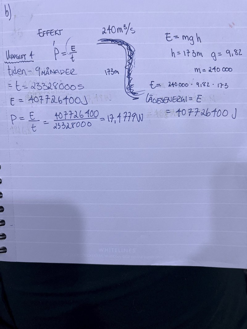 240 000 kg vatten per sekund faller 173 m. Det du glömde var just att det är 240000kg per sekund. Du fick en energi i enheten Joule. Så mycket energi omvandlas per sekund.