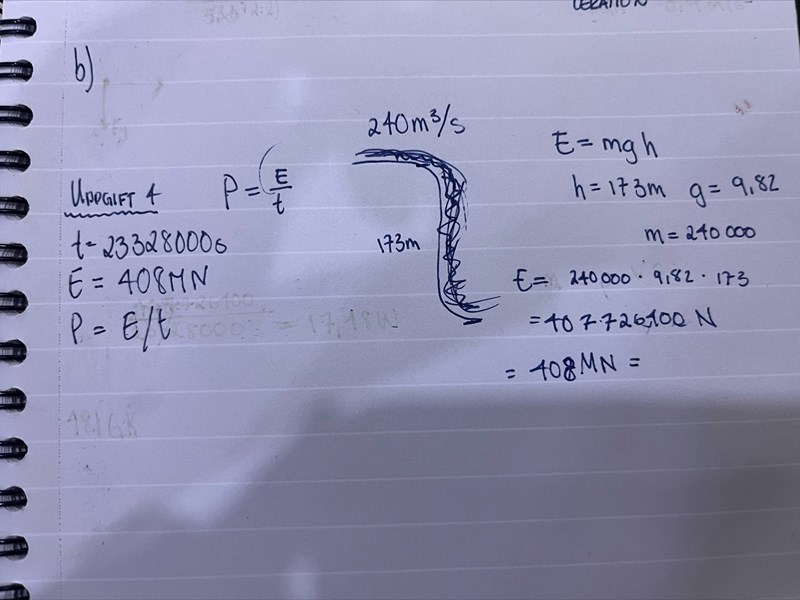 Jo för mgh = 408MJ och jag sen bara ska räkna per sekund borde de väll vara delat på en sekund eller?vilket blir 408 MW.
