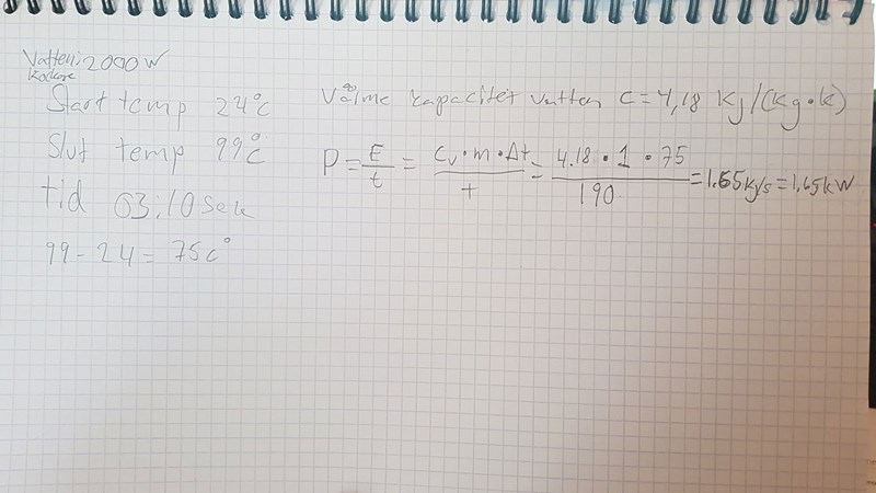 Laguna skrev:Jag tycker 1,65/2 = 82% är en dålig verkningsgrad för en vattenkokare, men jag vet inte om det är fel och i så fall var felet är.