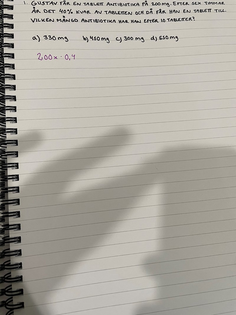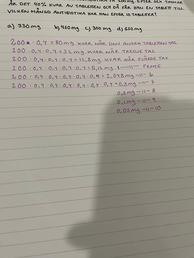 Nej, för den andra tabletten kommer det vara 200*0,4⁸ mg. Ser du varför?