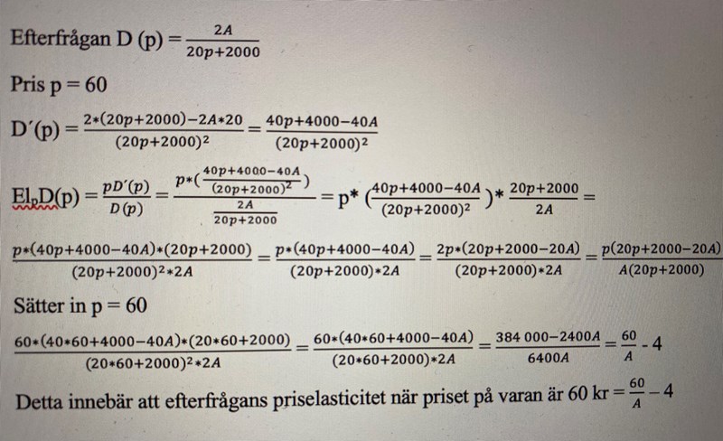 Fråga: efterfrågan på en vara ges av funktionen D(p)= 2A/(20p+2000) där p är priset per enhet och A är en (obekant) kostnad. Vad är efterfrågans priselasticitet då priset är p=60. Beräkna den approximativa formeln för elasticitet, den procentuella minskningen i efterfrågan då priset ökar från 60 till 70 kr per enhet, och jämför med det exakta värdet.