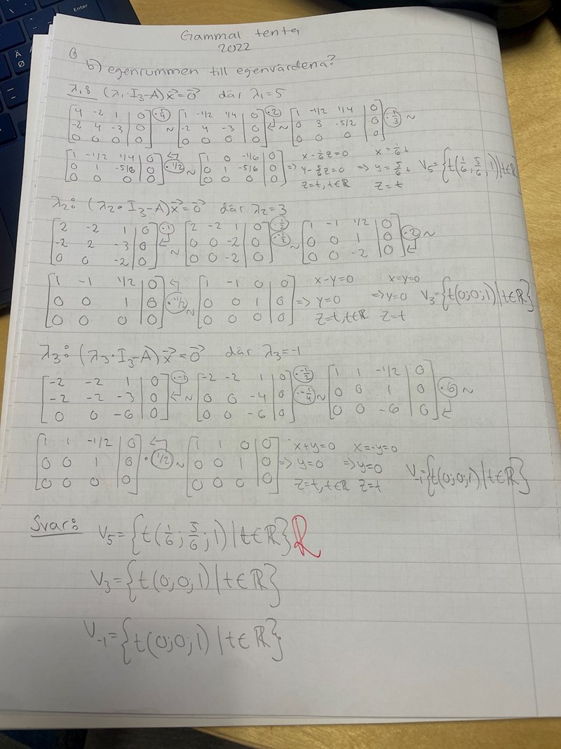 Gustor skrev:I beräkningen för sätter du , men av andra raden i sista matrisen måste ju , inte . Du får kvar att , så om så är . Då får du vektorerna . Något liknande händer i sista beräkningen.