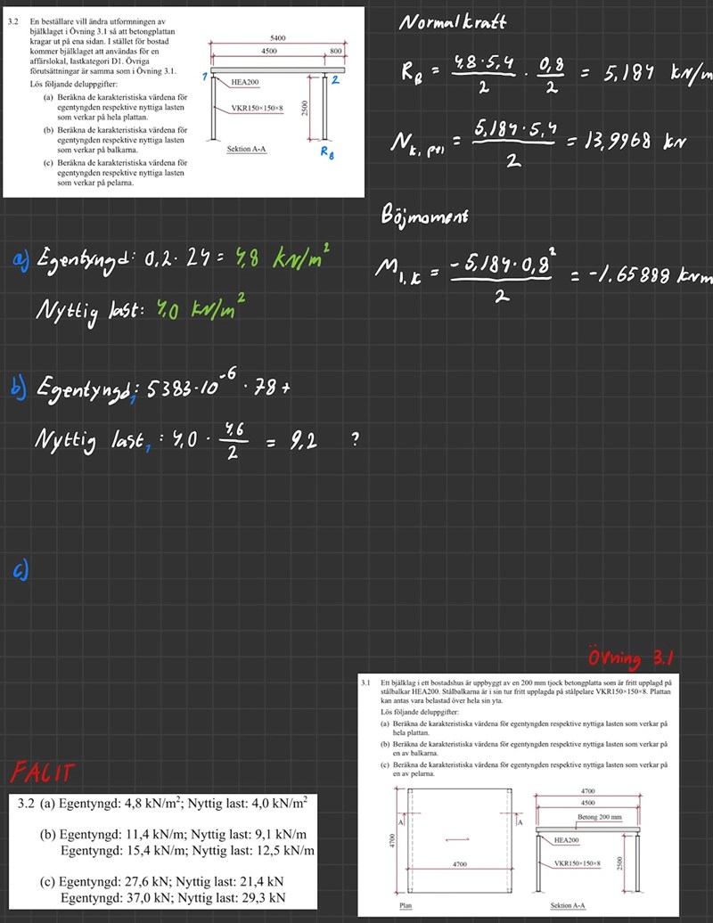 Jag har i uppgift att försöka beräkna de karakteristiska värdena för egentyngden respektive nyttiga lasten som verkar på balkarna och pelarna, se deluppgift (b) och (c). Jag kommer ingenvart med beräkningen då jag inte vet hur jag ska räkna med avseende på betongplattan som kragar ut på ena sidan. Tacksam för hjälp.